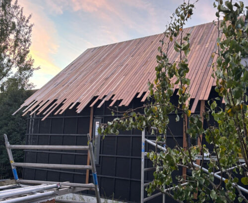 oplevering, start bouwEindelijk! De eerste houten delen zijn aangebracht op het dak van de schuurwoning in Hilvarenbeek. Het zwarte beeld van de onderdakfolie dat lange tijd het aanzicht bepaald...