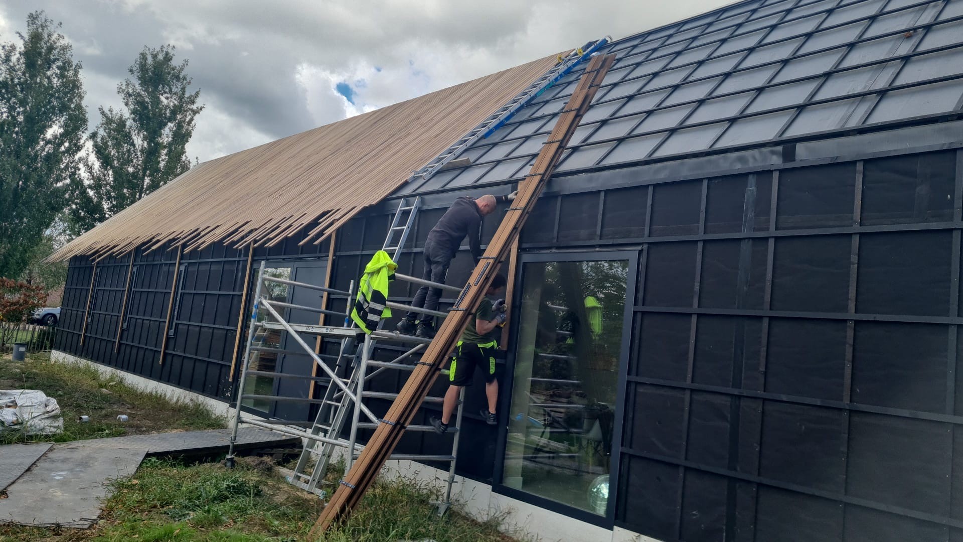 Eindelijk! De eerste houten delen zijn aangebracht op het dak van de schuurwoning in Hilvarenbeek. Het zwarte beeld van de onderdakfolie dat lange tijd het aanzicht bepaald heeft gaat langzaam verdwijnen. De gevels en het dak worden volledig bekleed met verticale houten delen die bovendien uitlijnen met de verschillende gevelopeningen. Een enorme klus, maar het resultaat mag er zijn!